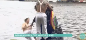 Alison était en plein milieu d’un amusant bulletin météo sur un énorme modèle flottant de la Grande-Bretagne — que pouvait-il arriver ? En sautant vers l’Irlande, un des marins a fini dans la rivière Mersey en essayant de la rattraper ! Même si j’adore ce clip, à chaque visionnage je ressens de la gêne par procuration.
